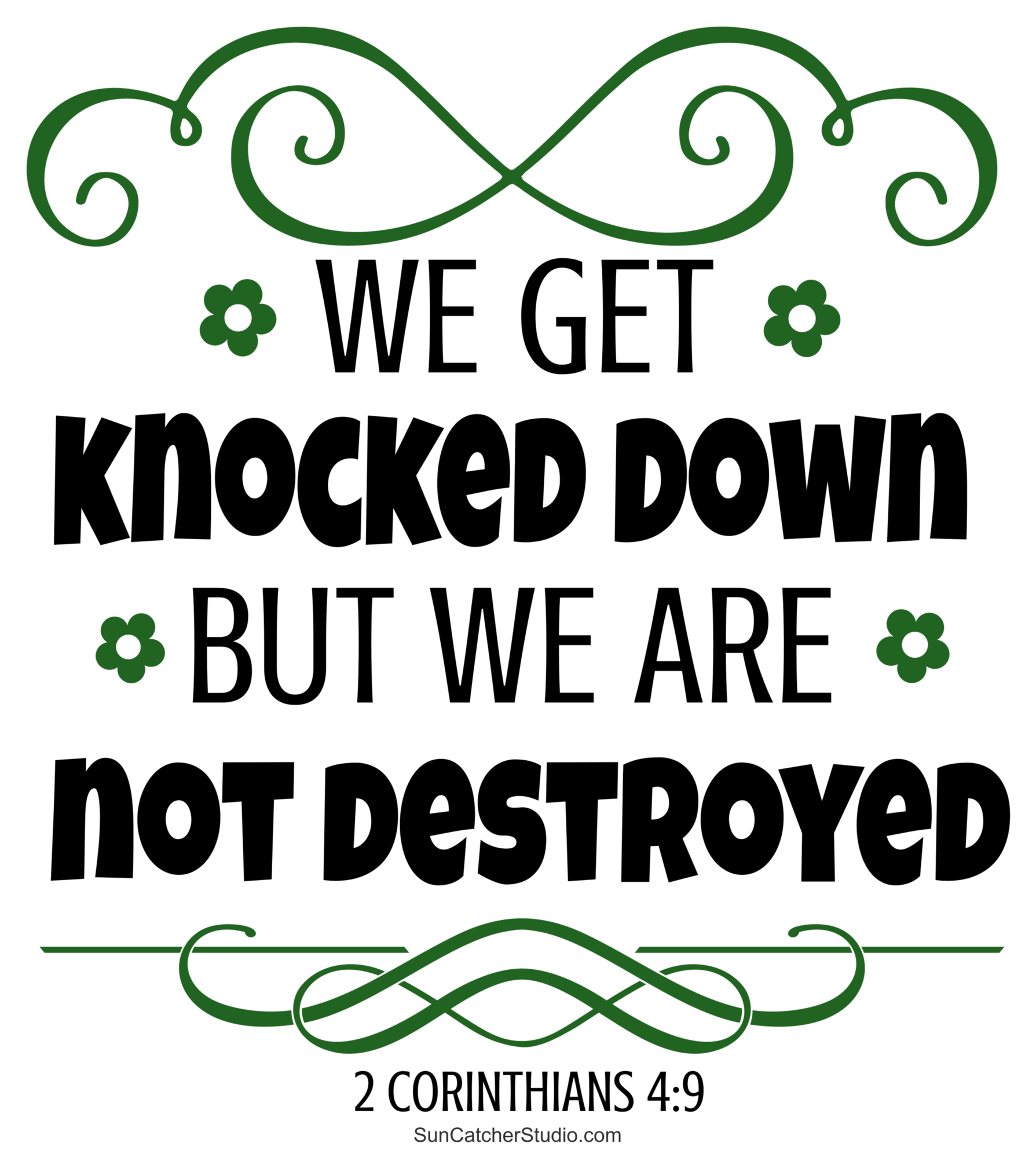 2 Corinthians 4:9. We get knocked down but we are not destroyed. Free, printable, Bible verse, Bible quote, Christian, faith, religious, scripture verse, passages, Cricut design, clip art, svg file, template, pattern, stencil, silhouette, cut file, design, vector, shirt, cup, DIY crafts and projects, embroidery, pdf, vector, print, download.