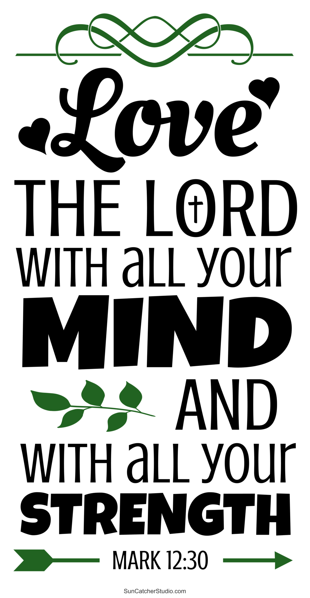 Mark 12:30. Love the Lord with all your mind and with all your strength. Free, printable, Bible verse, Bible quote, Christian, faith, religious, scripture verse, passages, Cricut design, clip art, svg file, template, pattern, stencil, silhouette, cut file, design, vector, shirt, cup, DIY crafts and projects, embroidery, pdf, vector, print, download.