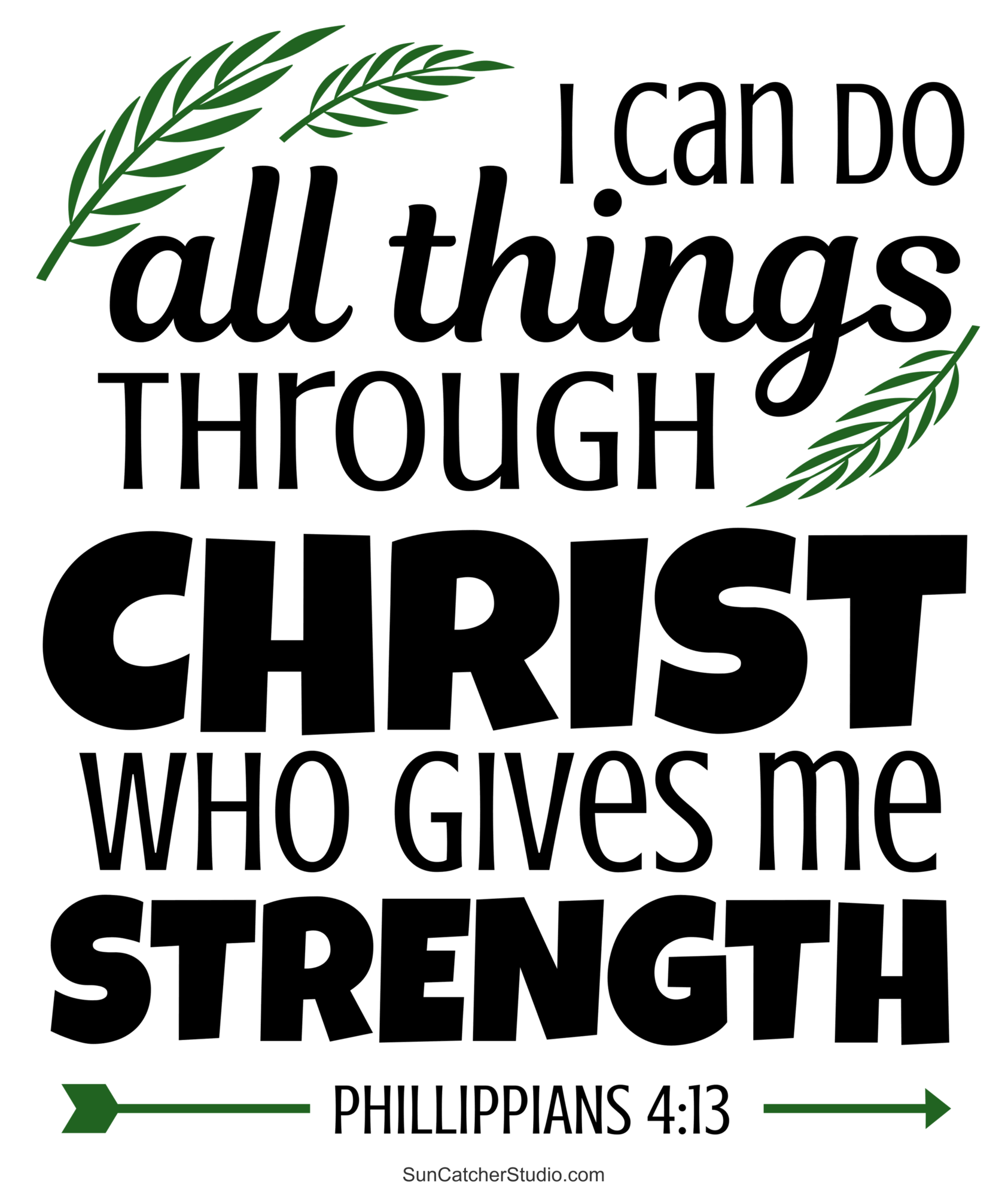 Phillippians 4:13. I can do all things through Christ who gives me strength. Free, printable, Bible verse, Bible quote, Christian, faith, religious, scripture verse, passages, Cricut design, clip art, svg file, template, pattern, stencil, silhouette, cut file, design, vector, shirt, cup, DIY crafts and projects, embroidery, pdf, vector, print, download.