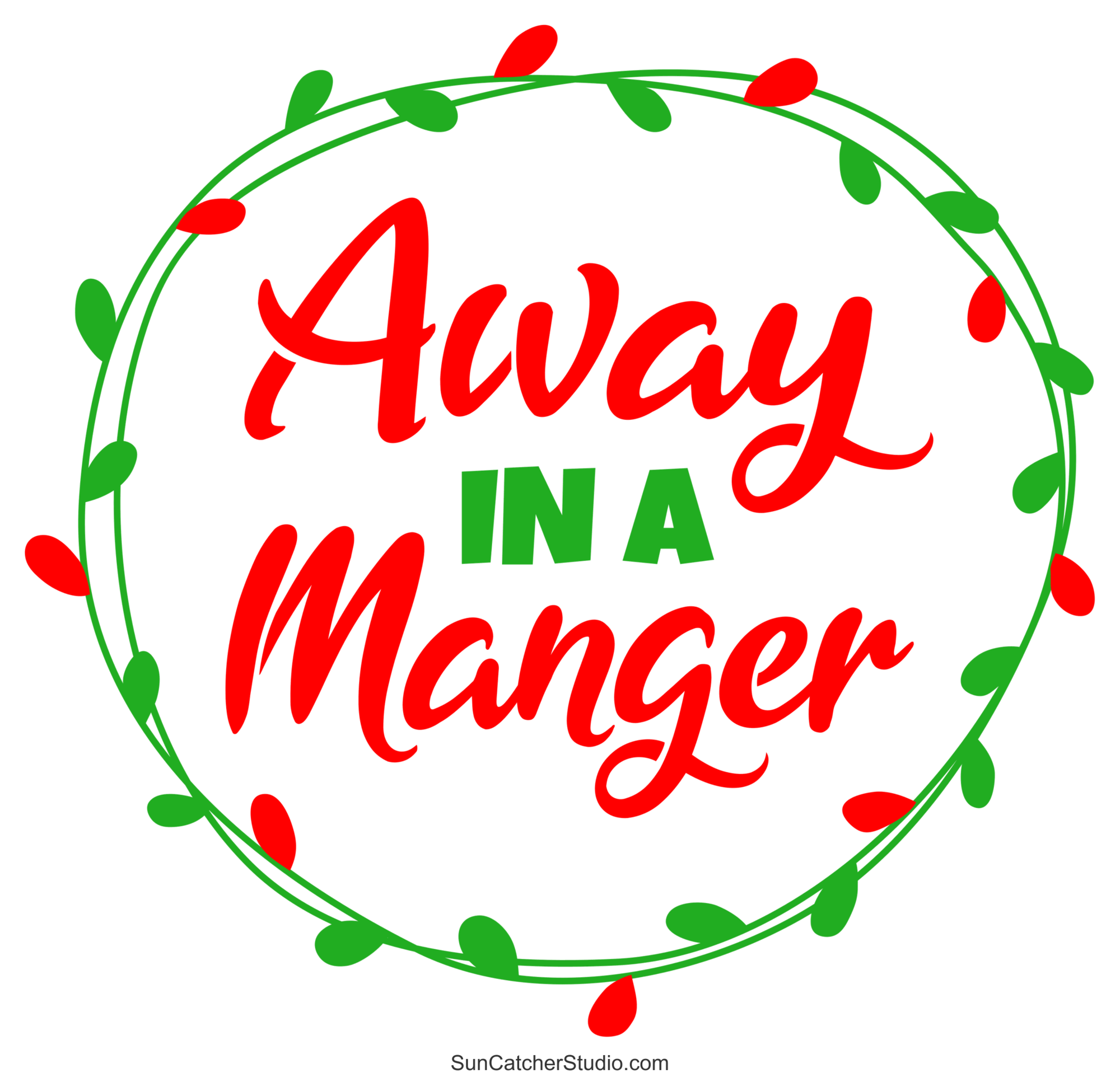 Away in a manger. Free, printable, Christmas quote, Christmas saying, holiday, decoration, winter, Cricut design, clip art, svg, template, pattern, stencil, silhouette, cut file, design, vector, shirt, cup, DIY crafts and projects, embroidery, pdf, vector, print, download.