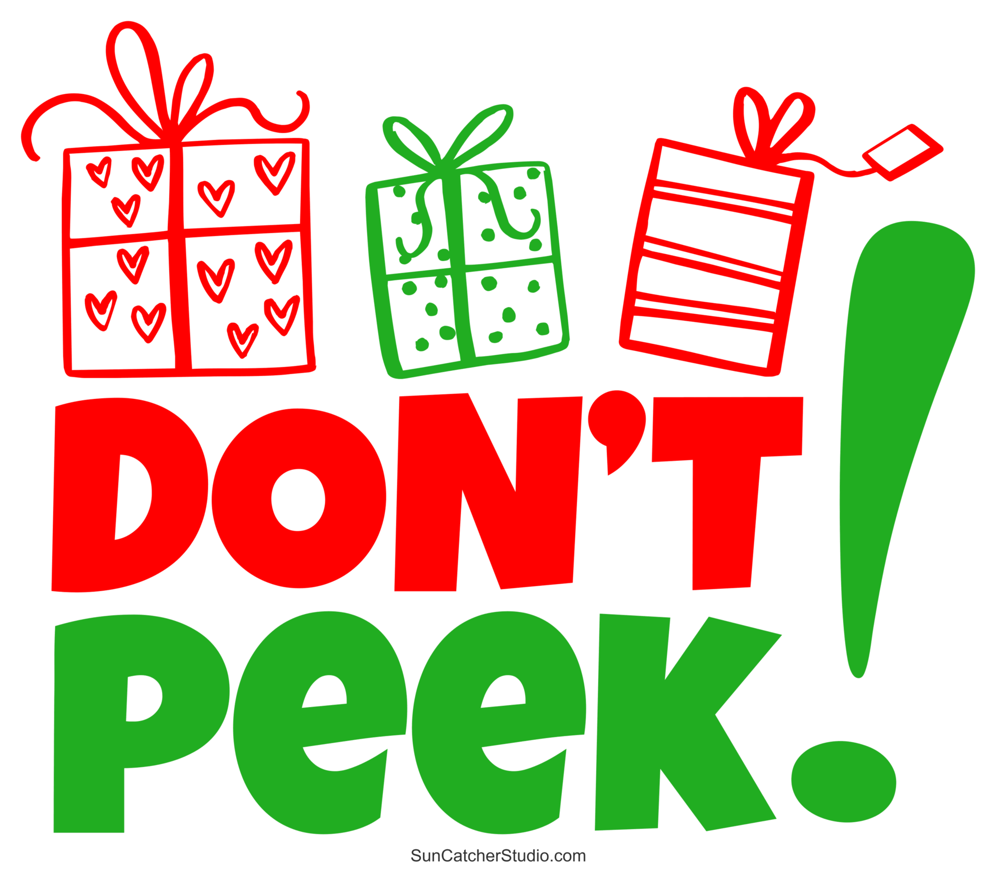 Don't peek. Free, printable, Christmas quote, Christmas saying, holiday, decoration, winter, Cricut design, clip art, svg, template, pattern, stencil, silhouette, cut file, design, vector, shirt, cup, DIY crafts and projects, embroidery, pdf, vector, print, download.