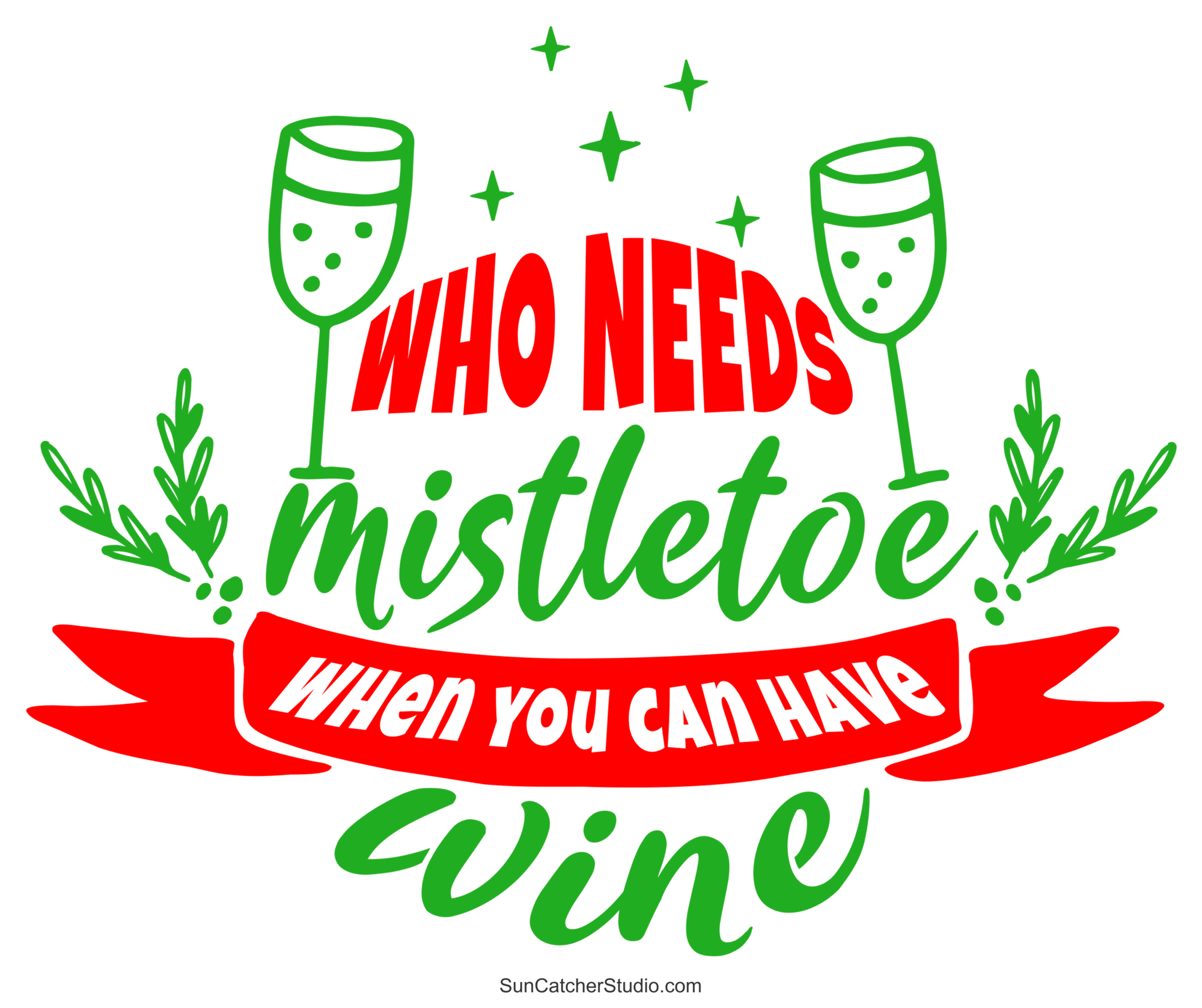 Who needs mistletoe, when you can have wine. Free, printable, Christmas quote, Christmas saying, holiday, decoration, winter, Cricut design, clip art, svg, template, pattern, stencil, silhouette, cut file, design, vector, shirt, cup, DIY crafts and projects, embroidery, pdf, vector, print, download.