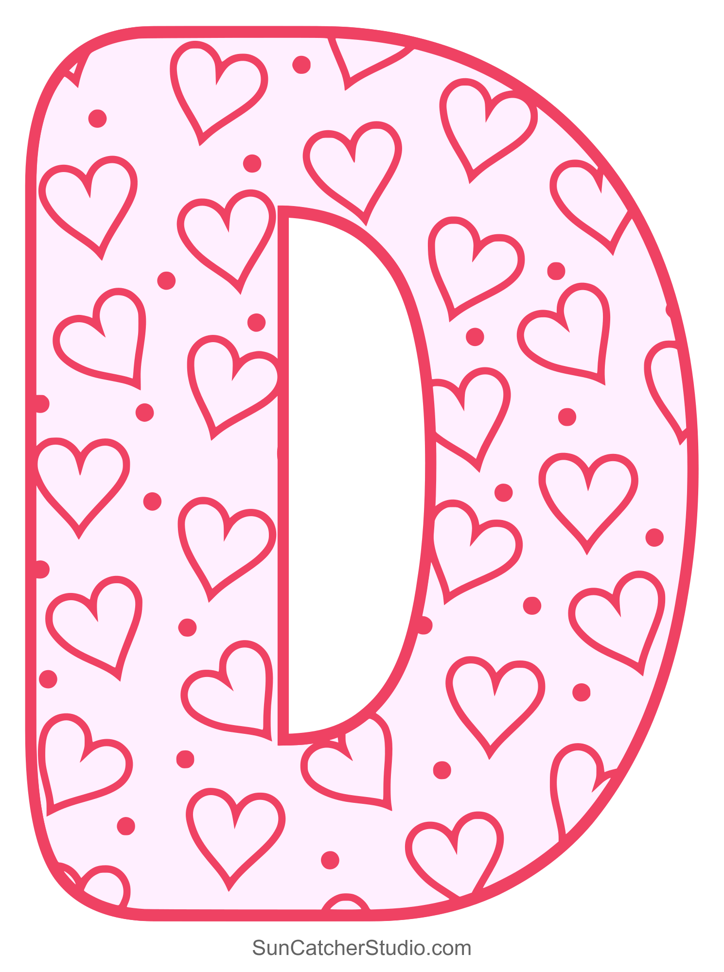 D - letter stencil. Heart, Valentine's Day, red, hearts, love, monogram, font, free, printable, holiday, alphabet, abc, letter, lettering, pattern, template, stencil, outline, printable, clipart, decoration, design, vector, svg, print, download.