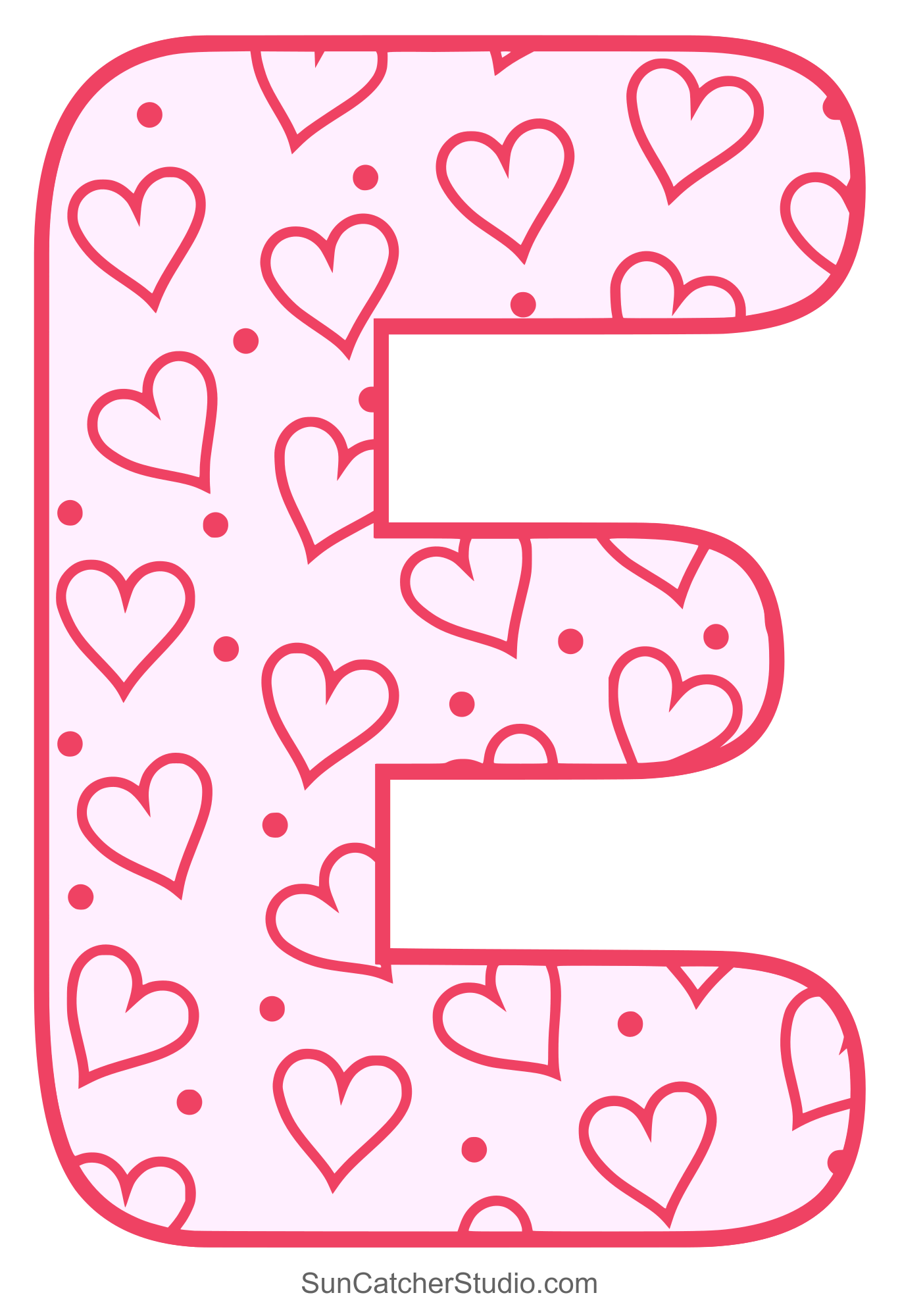 E - letter stencil. Heart, Valentine's Day, red, hearts, love, monogram, font, free, printable, holiday, alphabet, abc, letter, lettering, pattern, template, stencil, outline, printable, clipart, decoration, design, vector, svg, print, download.