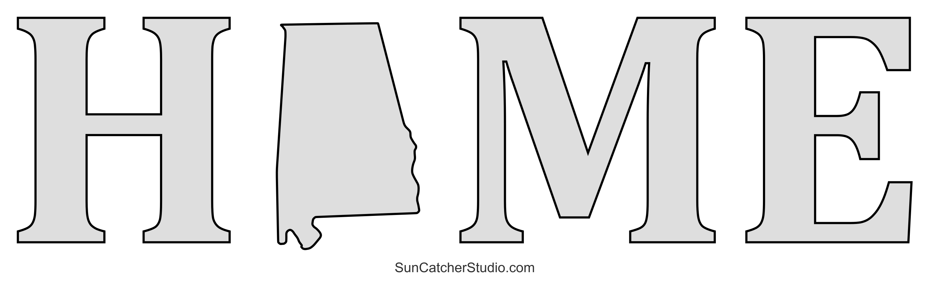 Welcome to the Alabama Map Outline page. Your free resource for state-shaped templates, stencils, and design patterns. Ideal for crafting, coloring, decorating, or any creative project. Download scalable files in SVG, PNG, and PDF formats. Explore, personalize, and highlight Alabama in your next DIY or artistic work. Return to Maps of all 50 United States (US) states.