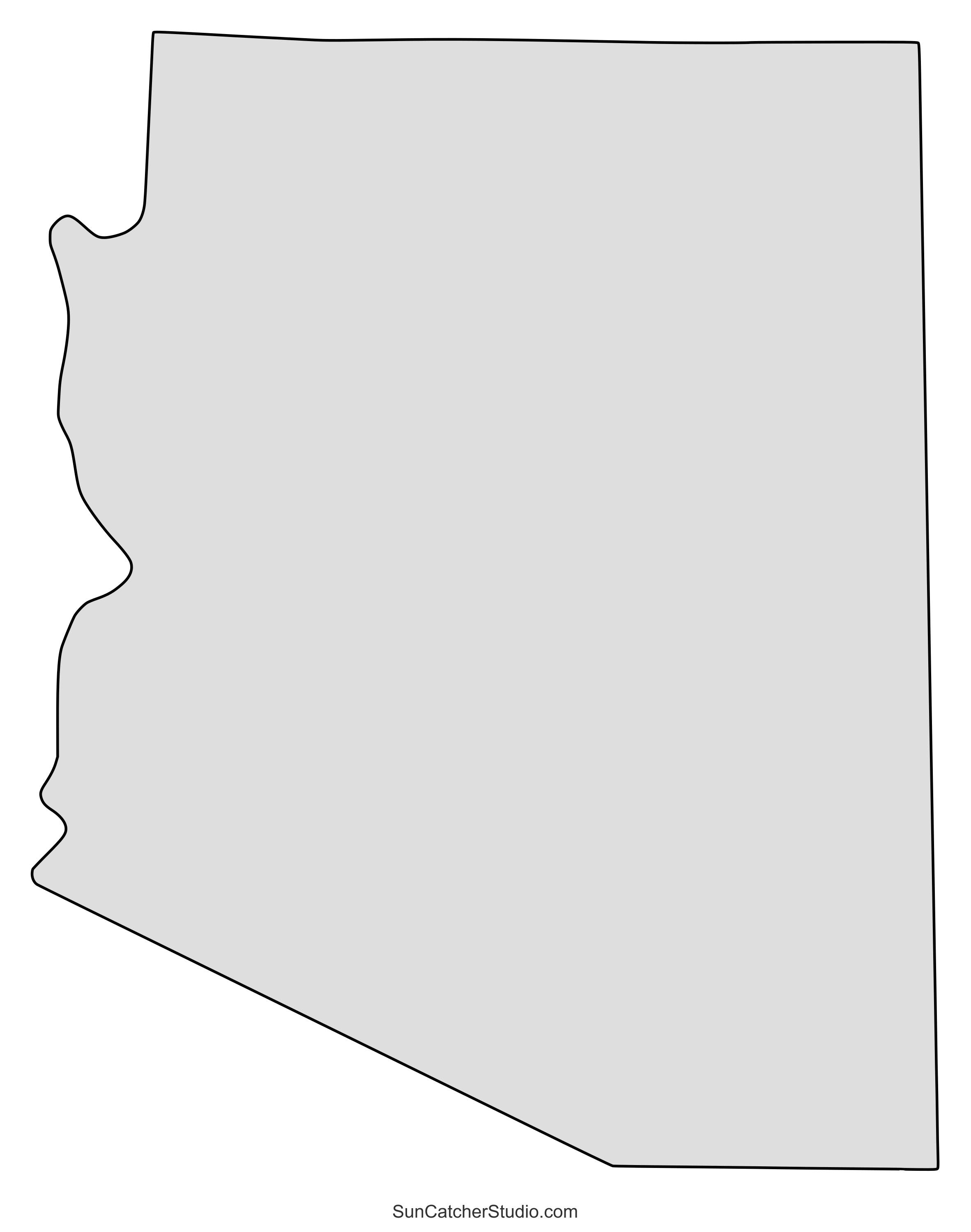 Welcome to the Arizona Map Outline page. Your free resource for state-shaped templates, stencils, and design patterns. Ideal for crafting, coloring, decorating, or any creative project. Download scalable files in SVG, PNG, and PDF formats. Explore, personalize, and highlight Arizona in your next DIY or artistic work. Return to Maps of all 50 United States (US) states.