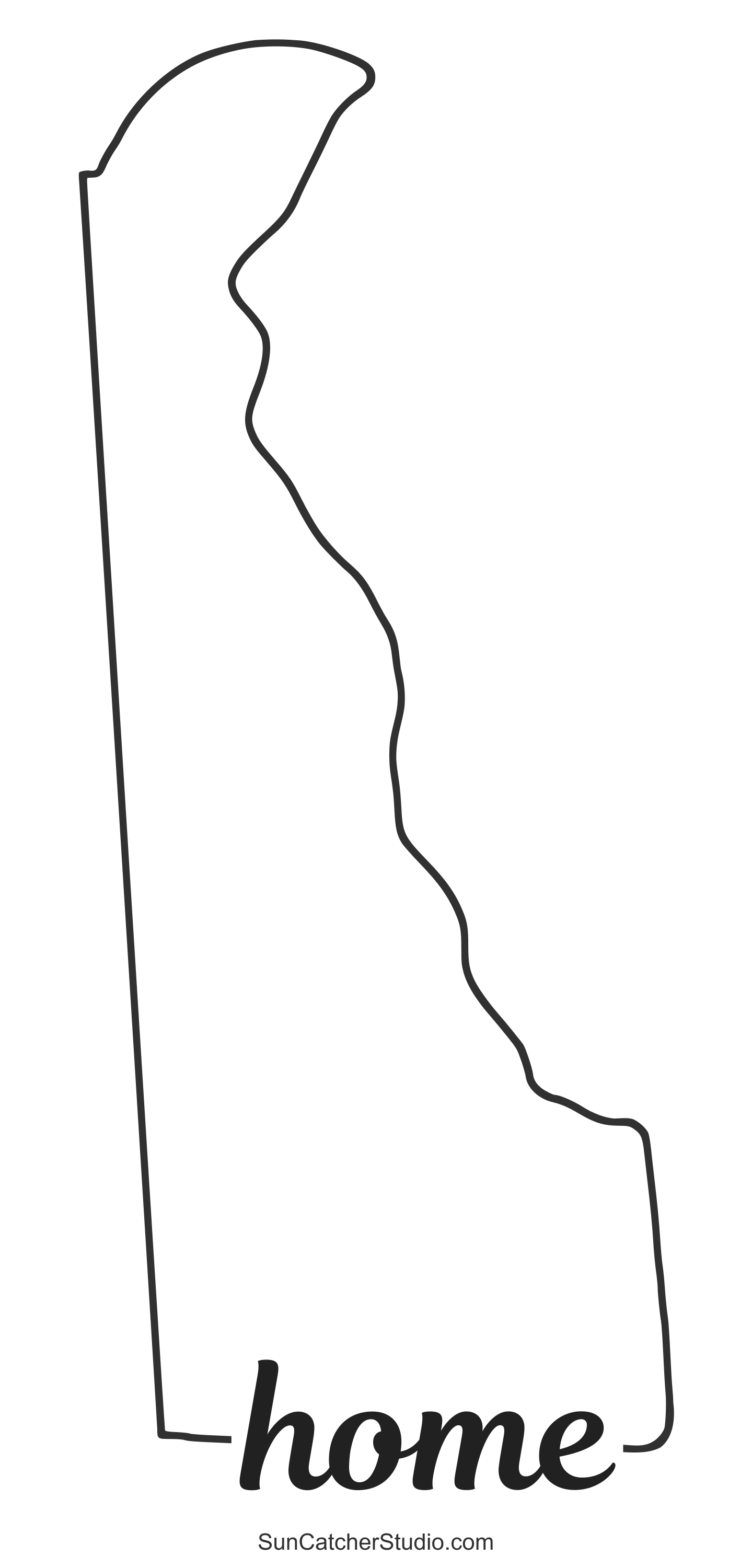 Welcome to the Delaware Map Outline page. Your free resource for state-shaped templates, stencils, and design patterns. Ideal for crafting, coloring, decorating, or any creative project. Download scalable files in SVG, PNG, and PDF formats. Explore, personalize, and highlight Delaware in your next DIY or artistic work. Return to Maps of all 50 United States (US) states.
