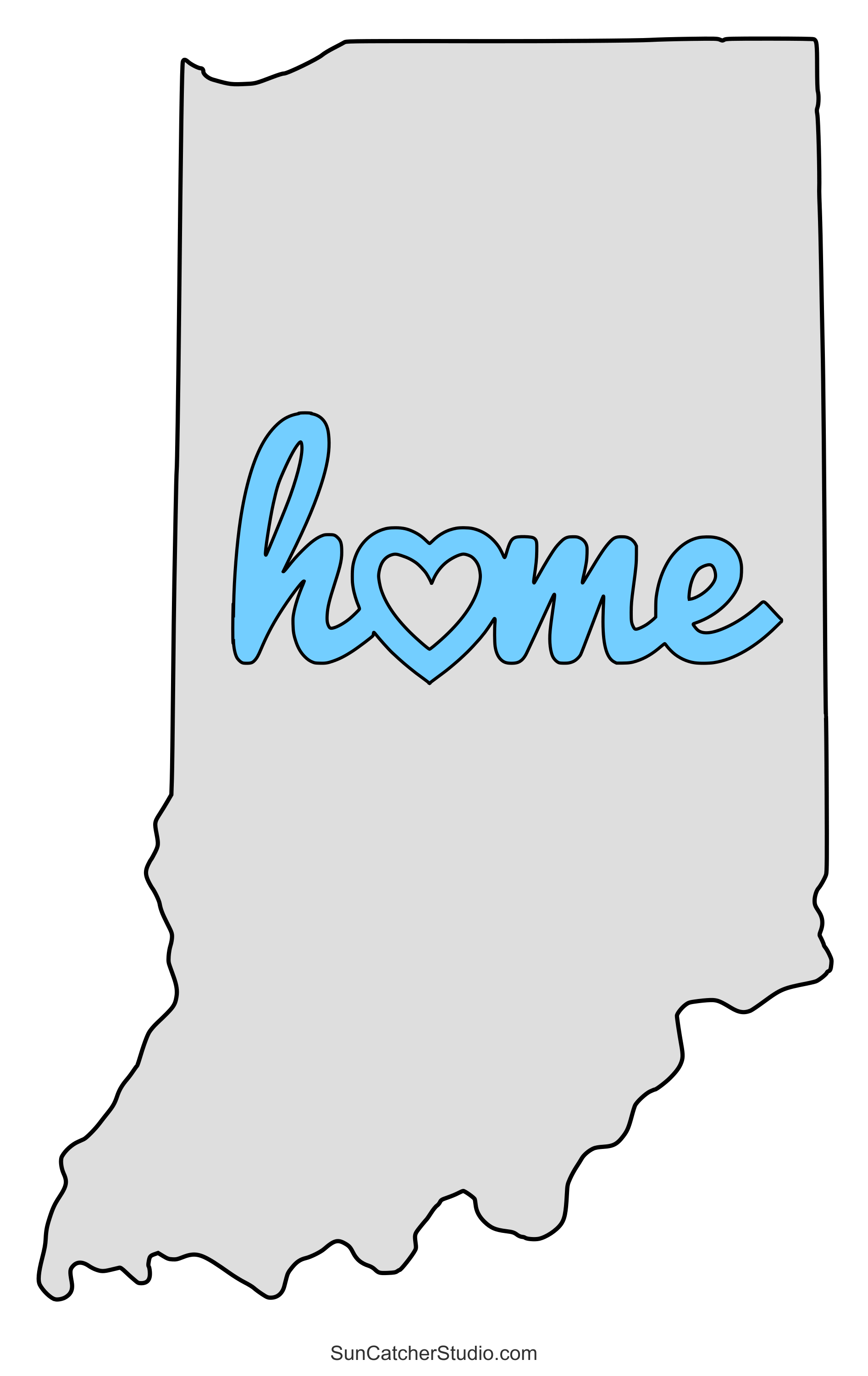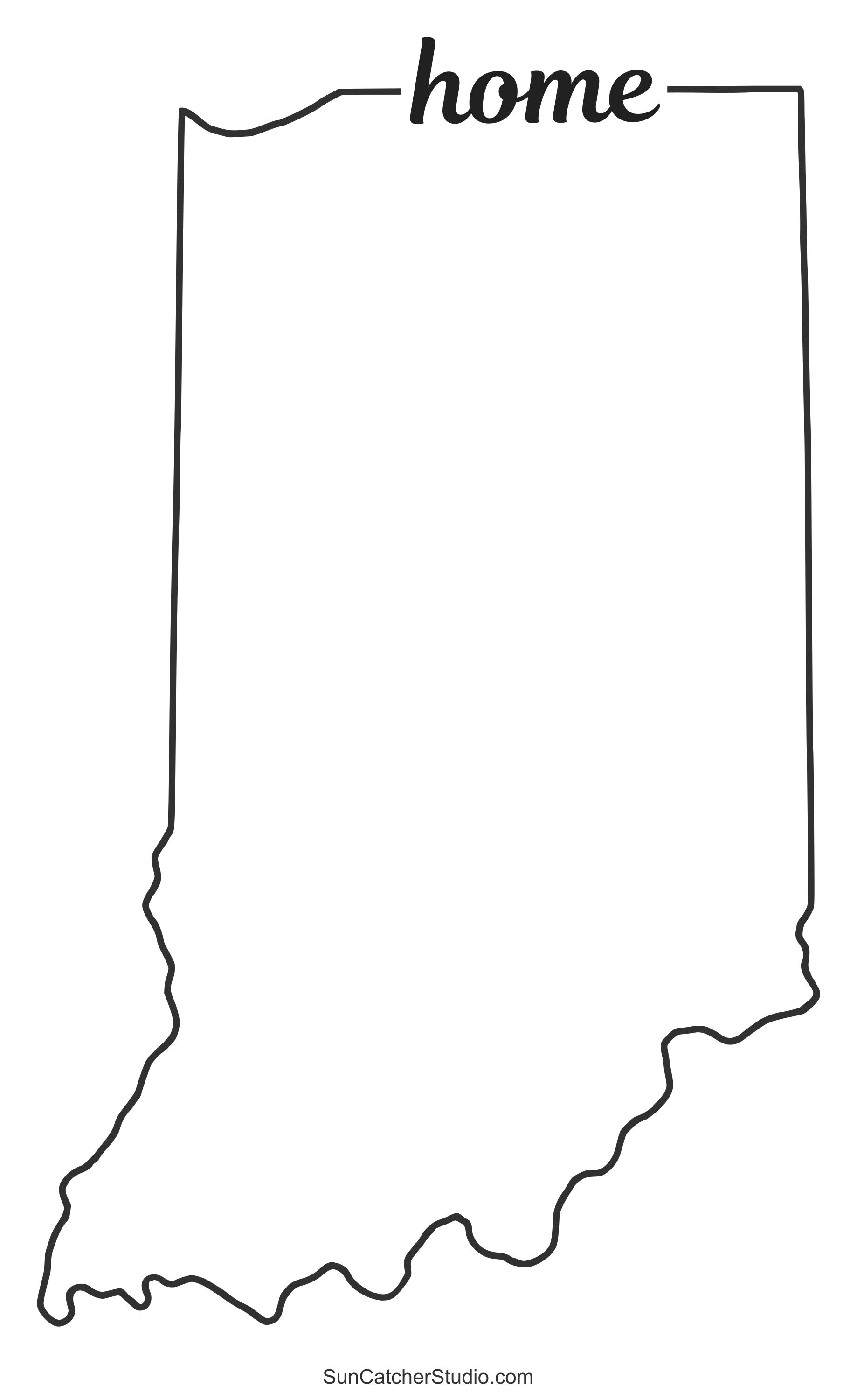 Welcome to the Indiana Map Outline page. Your free resource for state-shaped templates, stencils, and design patterns. Ideal for crafting, coloring, decorating, or any creative project. Download scalable files in SVG, PNG, and PDF formats. Explore, personalize, and highlight Indiana in your next DIY or artistic work. Return to Maps of all 50 United States (US) states.