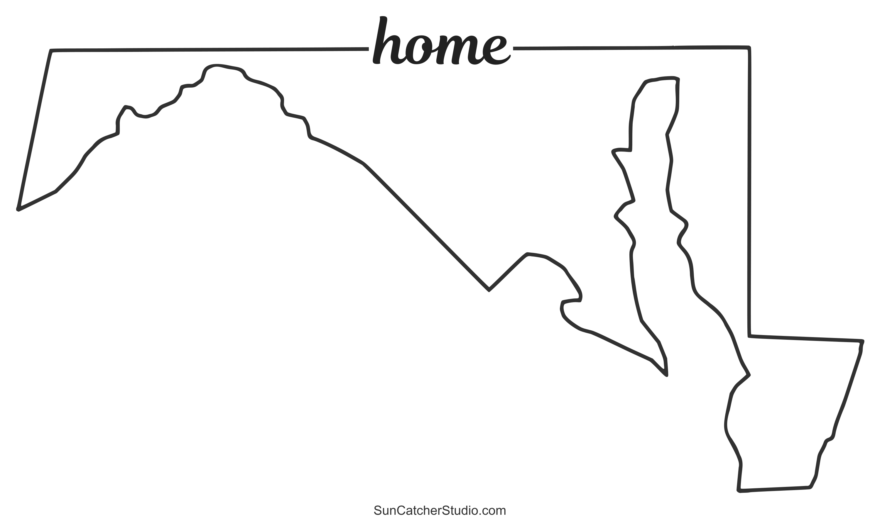 Welcome to the Maryland Map Outline page. Your free resource for state-shaped templates, stencils, and design patterns. Ideal for crafting, coloring, decorating, or any creative project. Download scalable files in SVG, PNG, and PDF formats. Explore, personalize, and highlight Maryland in your next DIY or artistic work. Return to Maps of all 50 United States (US) states.