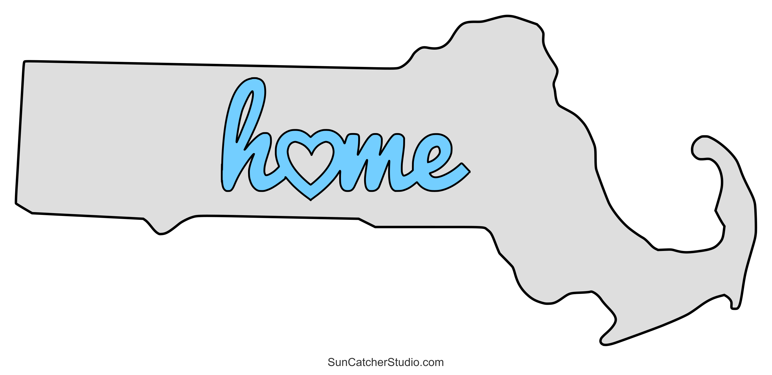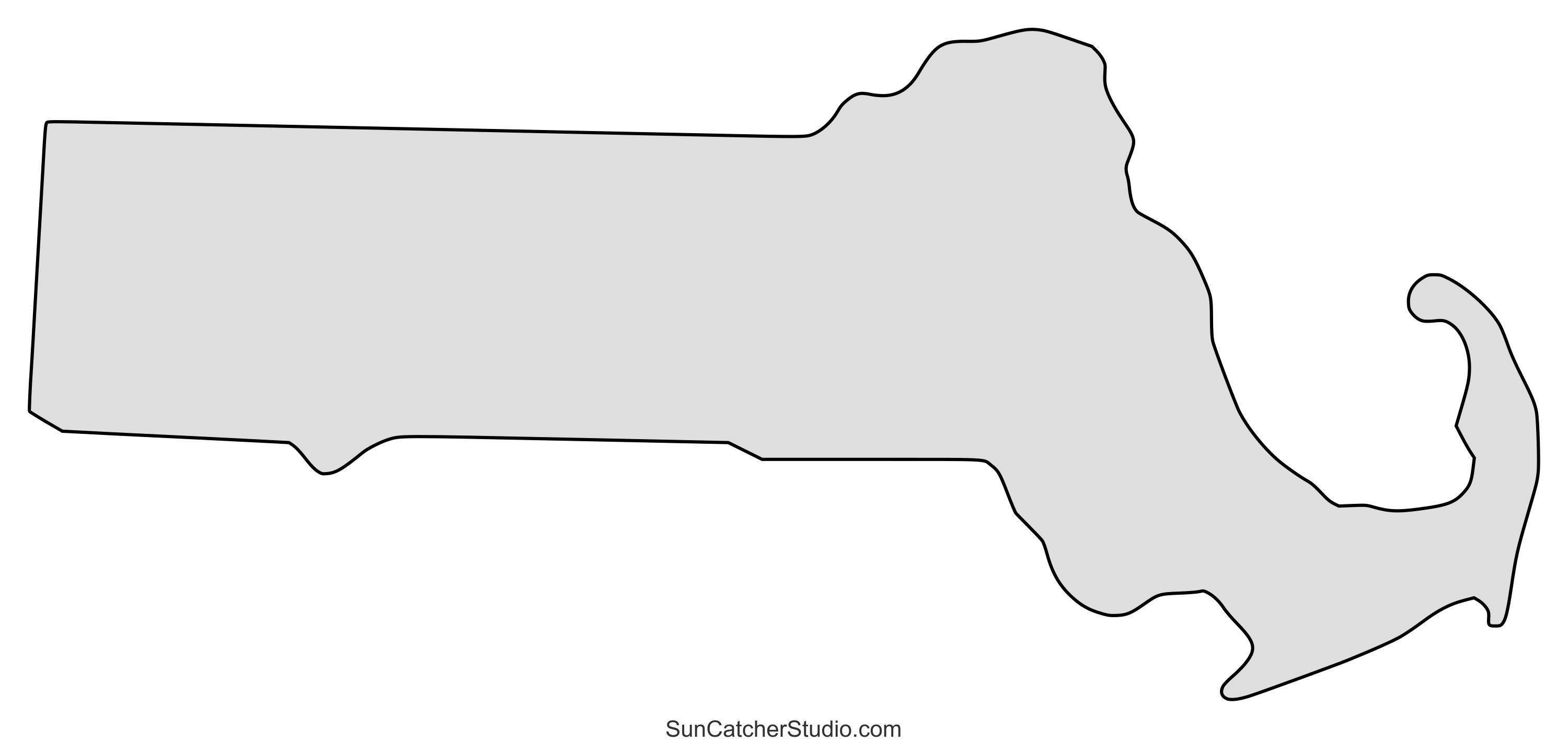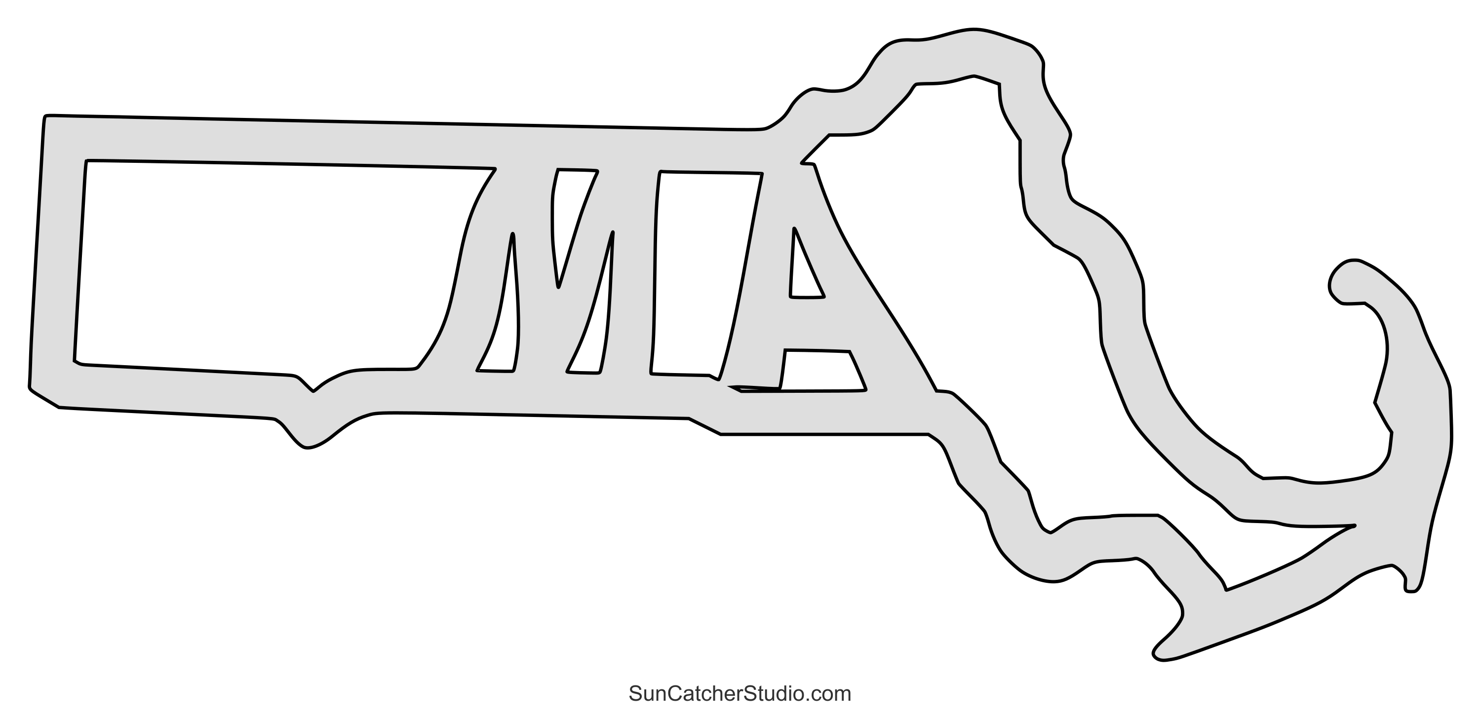 Welcome to the Massachusetts Map Outline page. Your free resource for state-shaped templates, stencils, and design patterns. Ideal for crafting, coloring, decorating, or any creative project. Download scalable files in SVG, PNG, and PDF formats. Explore, personalize, and highlight Massachusetts in your next DIY or artistic work. Return to Maps of all 50 United States (US) states.