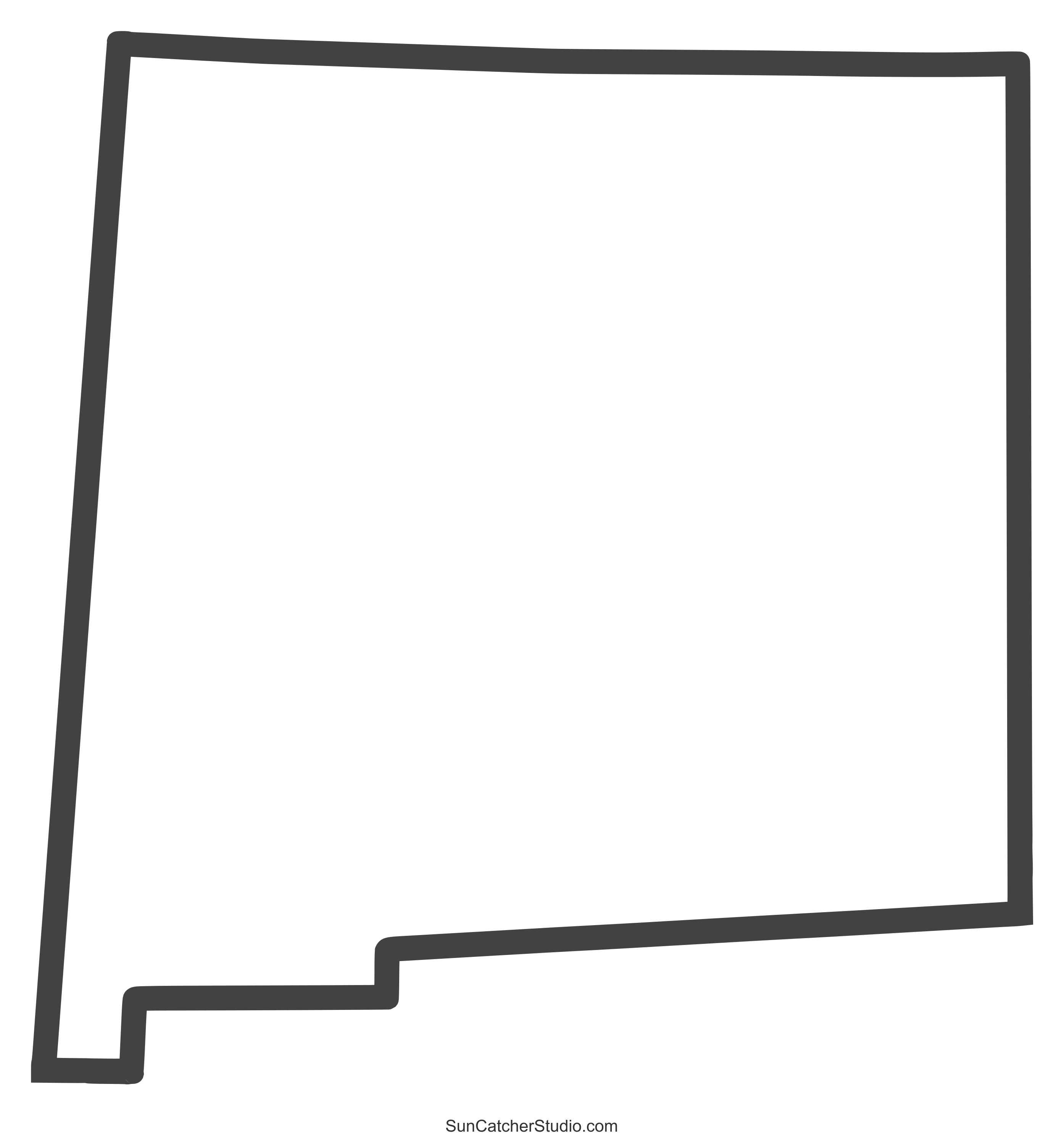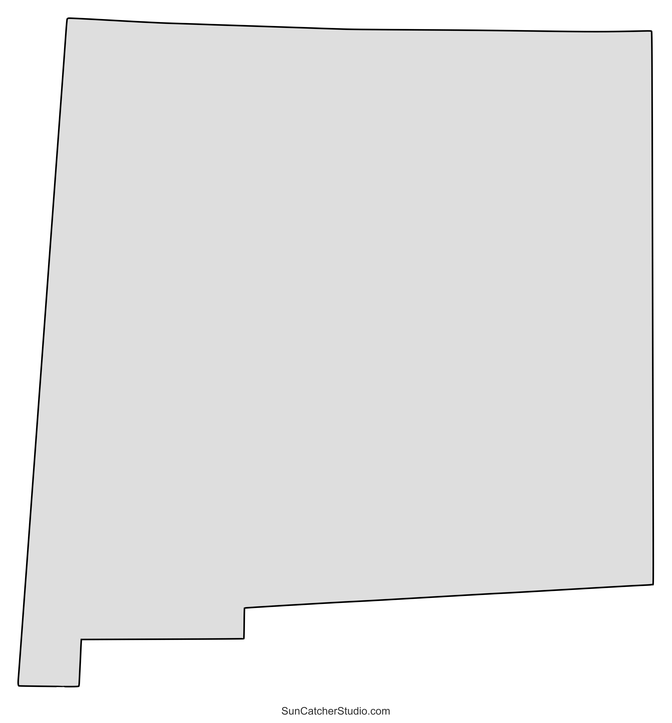 Welcome to the New Mexico Map Outline page. Your free resource for state-shaped templates, stencils, and design patterns. Ideal for crafting, coloring, decorating, or any creative project. Download scalable files in SVG, PNG, and PDF formats. Explore, personalize, and highlight New Mexico in your next DIY or artistic work. Return to Maps of all 50 United States (US) states.