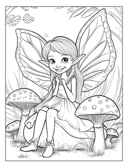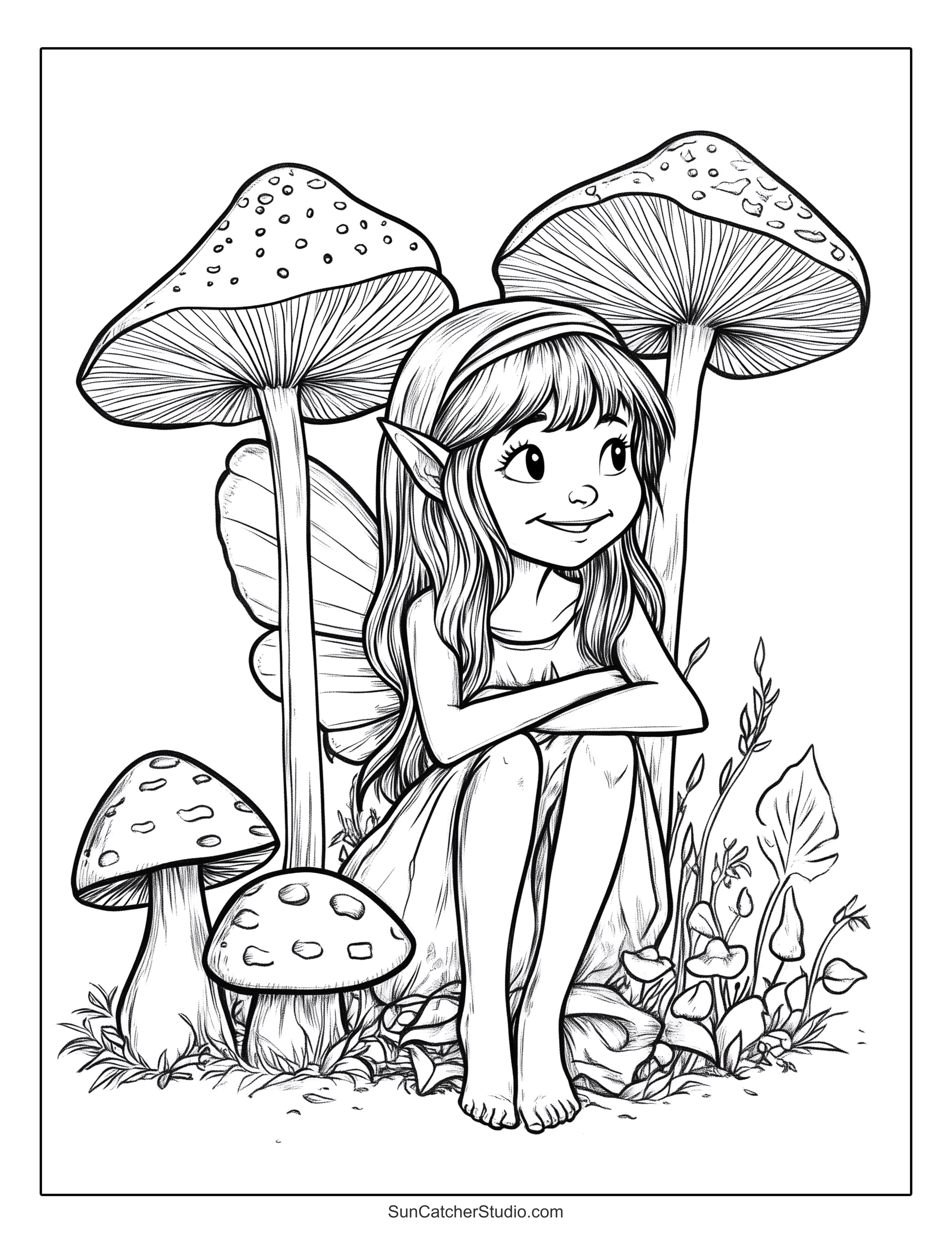 8. Fairy resting among magical mushrooms.  Fairy coloring page, fairy coloring sheet, color, coloring page, coloring, page, sheet, fairy, fairies, printable, free, book, pictures to color, easy, children, adult, print, download, pdf.