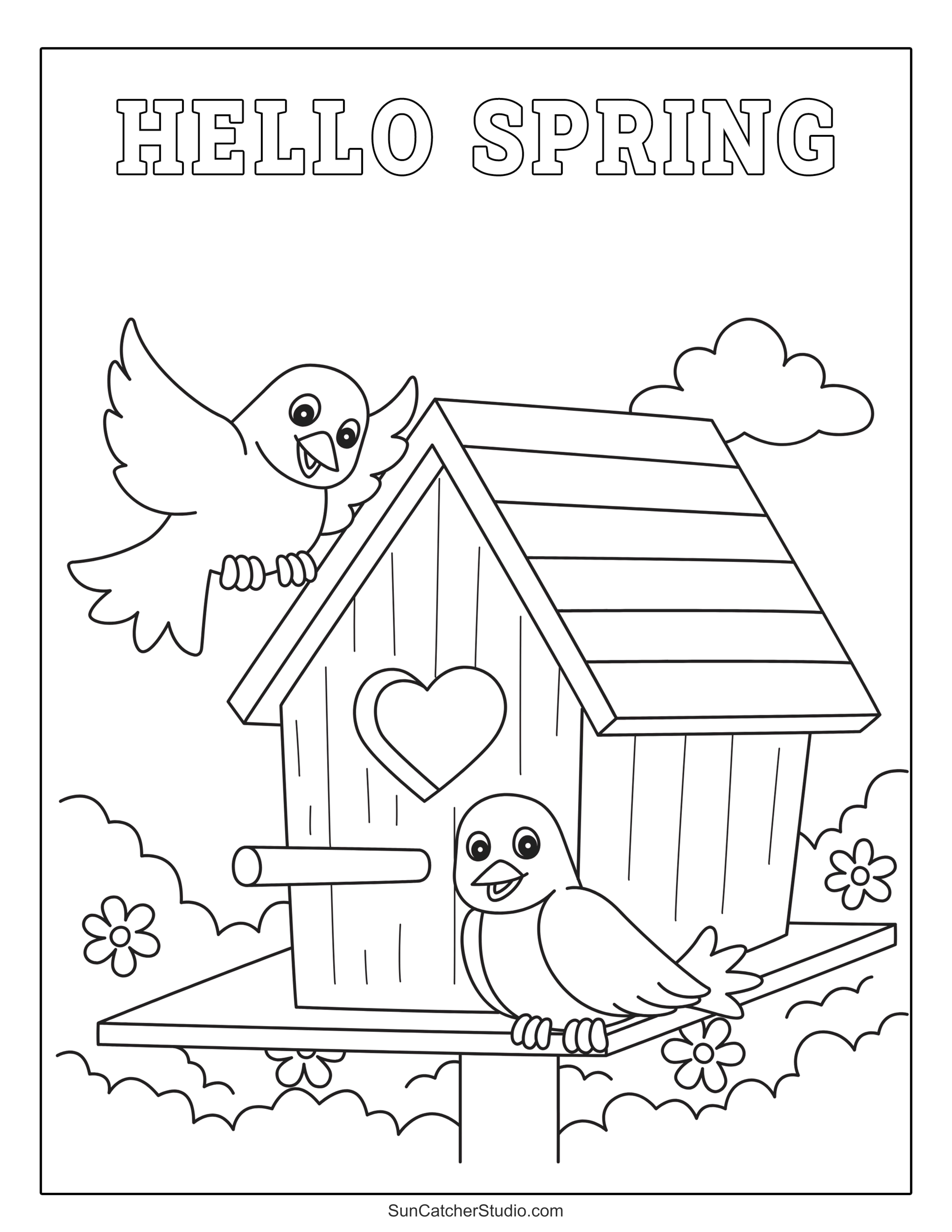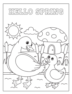 1. "Hello Spring" coloring sheet for kids. Spring coloring page, coloring sheet, color, coloring, page, sheet, printable, free, book, pictures to color, easy, children, adult, print, download, pdf.