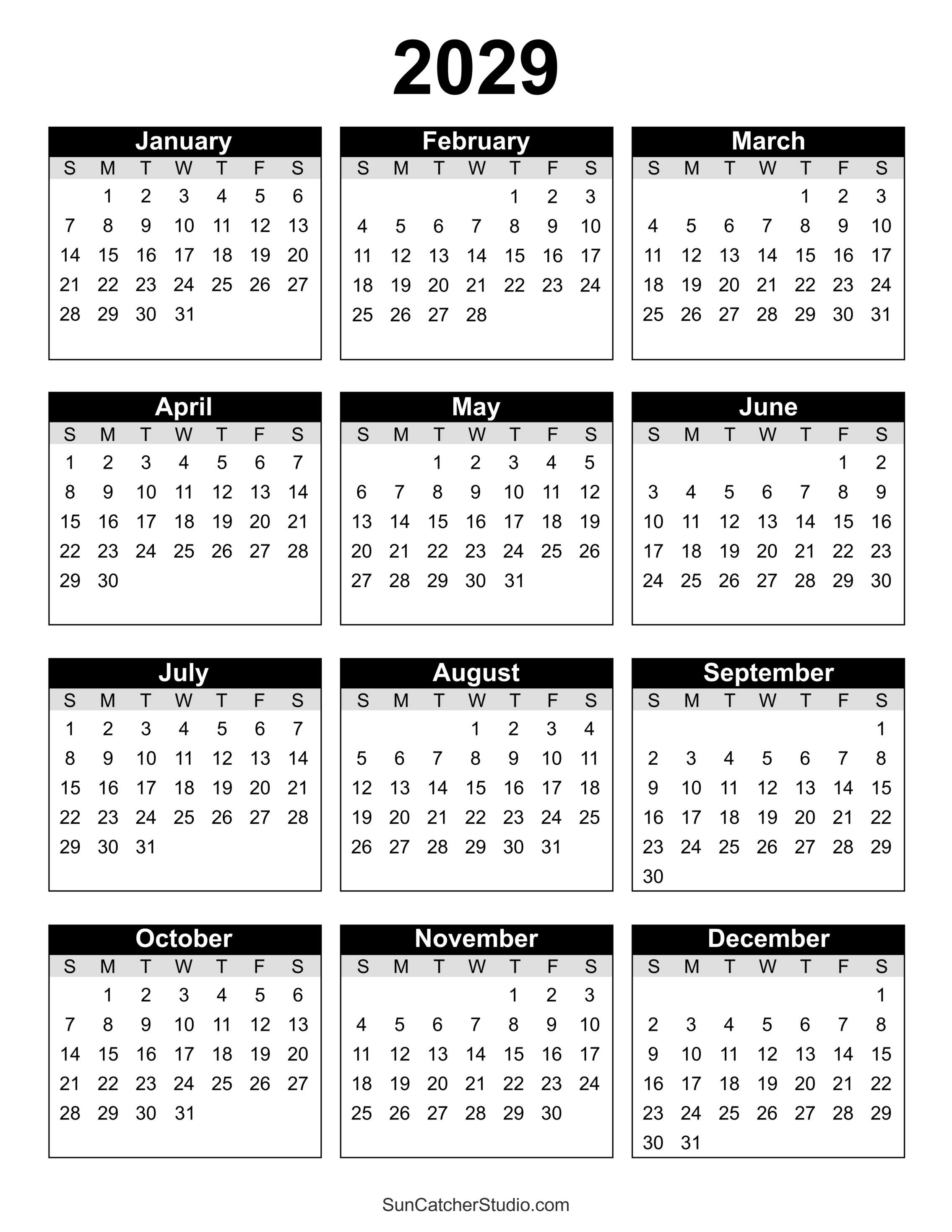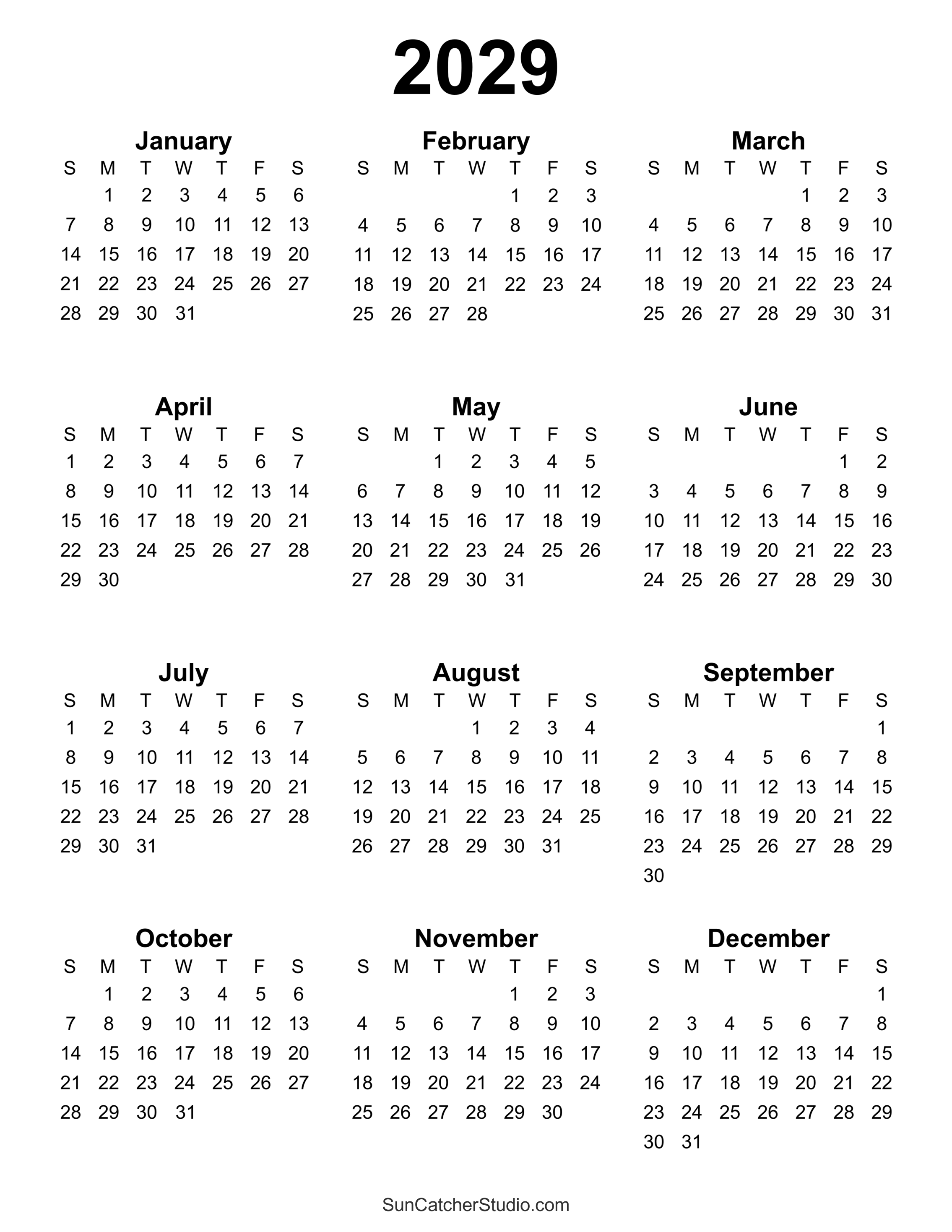 Printable Calendar 2029 (Yearly)