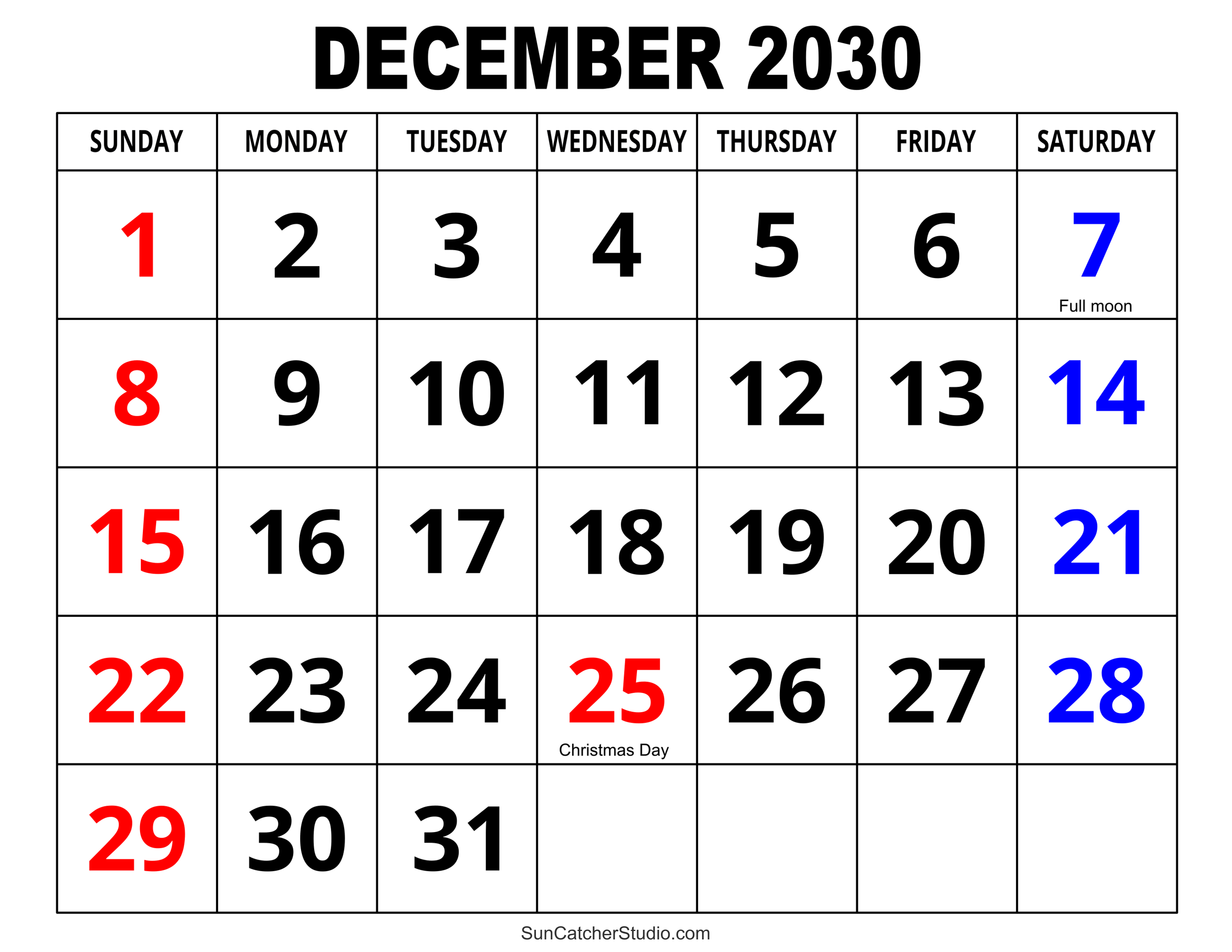 Free Printable December 2030 Calendar