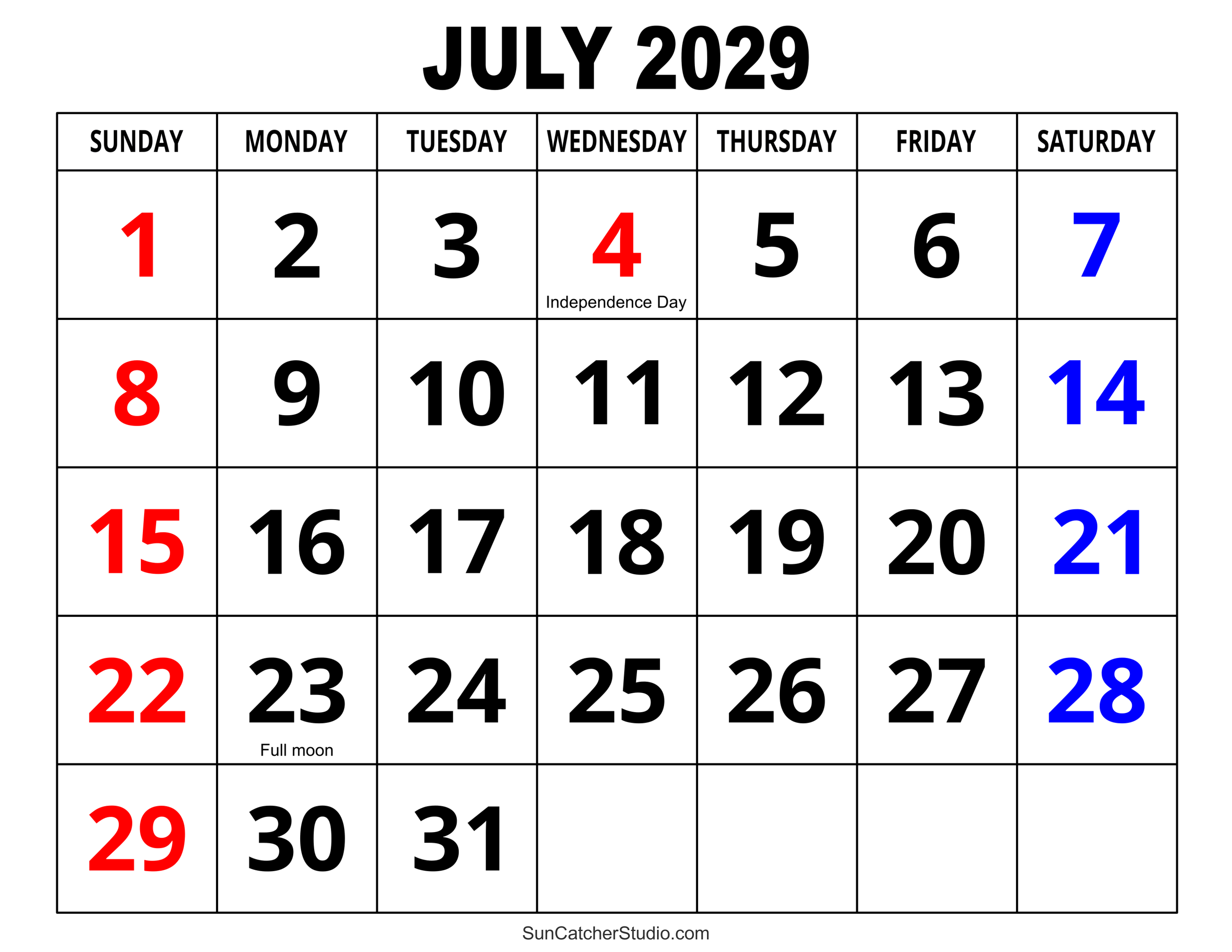 Printable July 2029 Calendar
