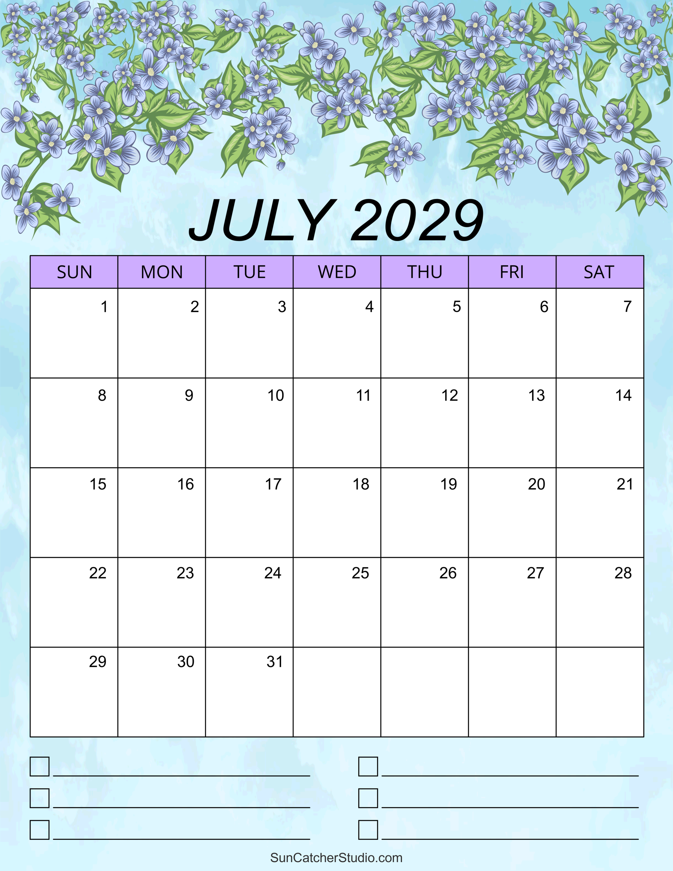 July 2029 printable calendar, free, DIY, monthly, blank, template, printable, PDF, PNG, print, download.
