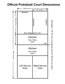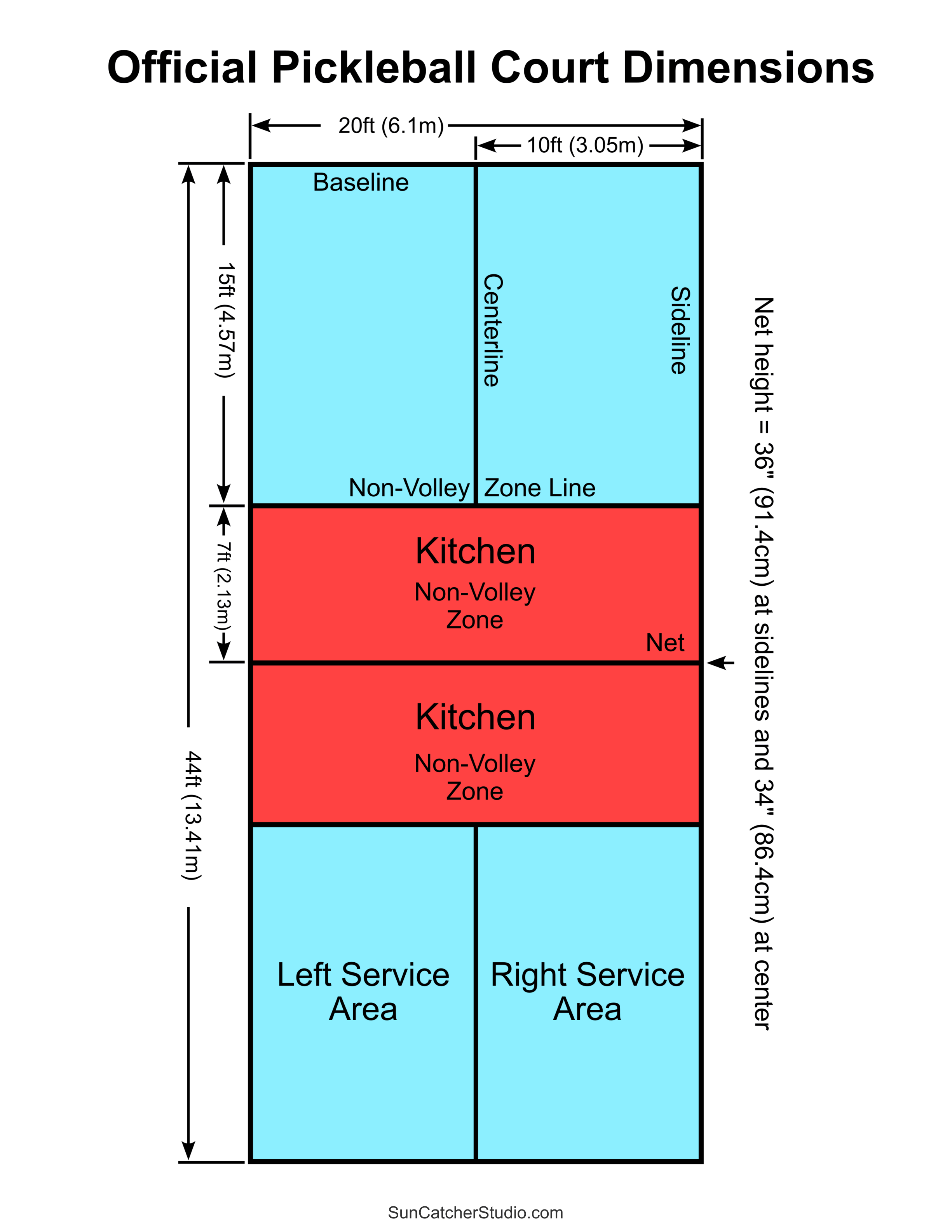 Within these dimensions, the court is divided into several key areas. Each side features a 7-foot non-volley zone—commonly known as “the kitchen”—closest to the net. Beyond that are the service courts, which are each 10 feet wide and 15 feet long, split into left and right sections by a centerline. The net stretches across the width of the court and is 36 inches high at the sidelines and 34 inches high in the center.