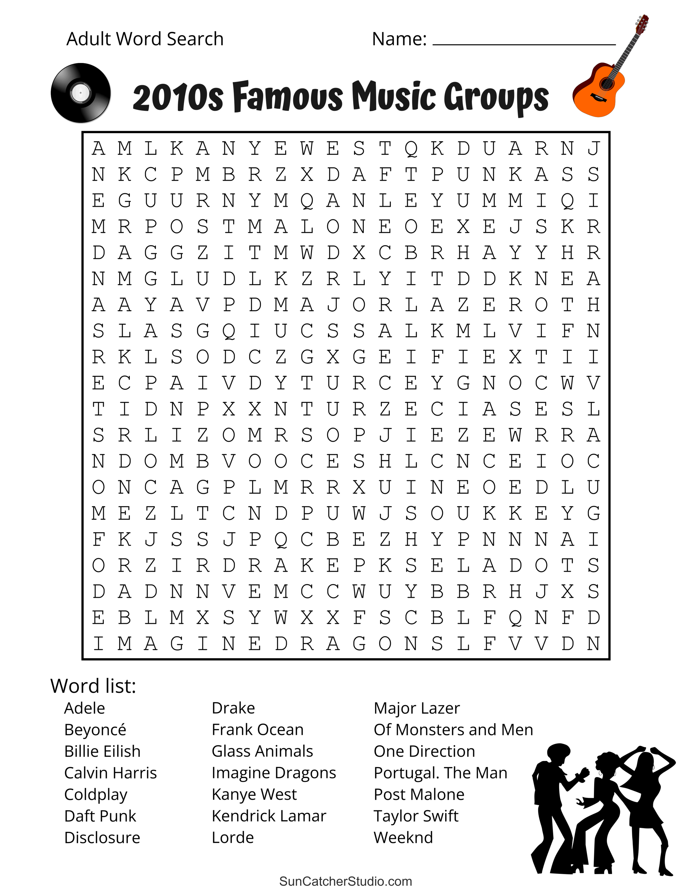 Famous 2010s Music Groups. Printable adult word search. Adult word search puzzles, 2010s, adult word find, printable, free, answers, hard, word search puzzle, large print, PDF.