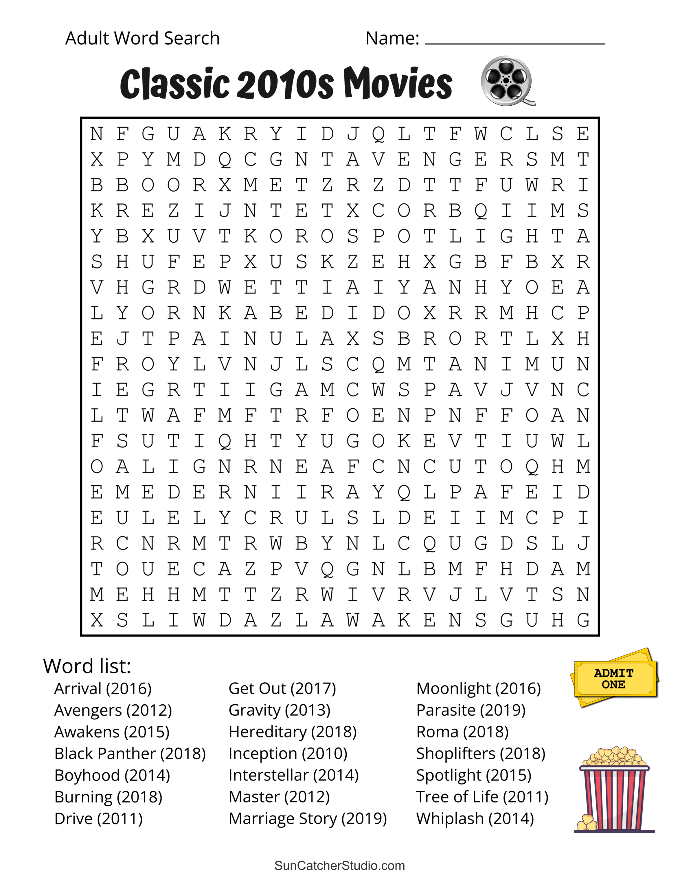 Classic 2010s Movies. Printable adult word search. Adult word search puzzles, 2010s, adult word find, printable, free, answers, hard, word search puzzle, large print, PDF.