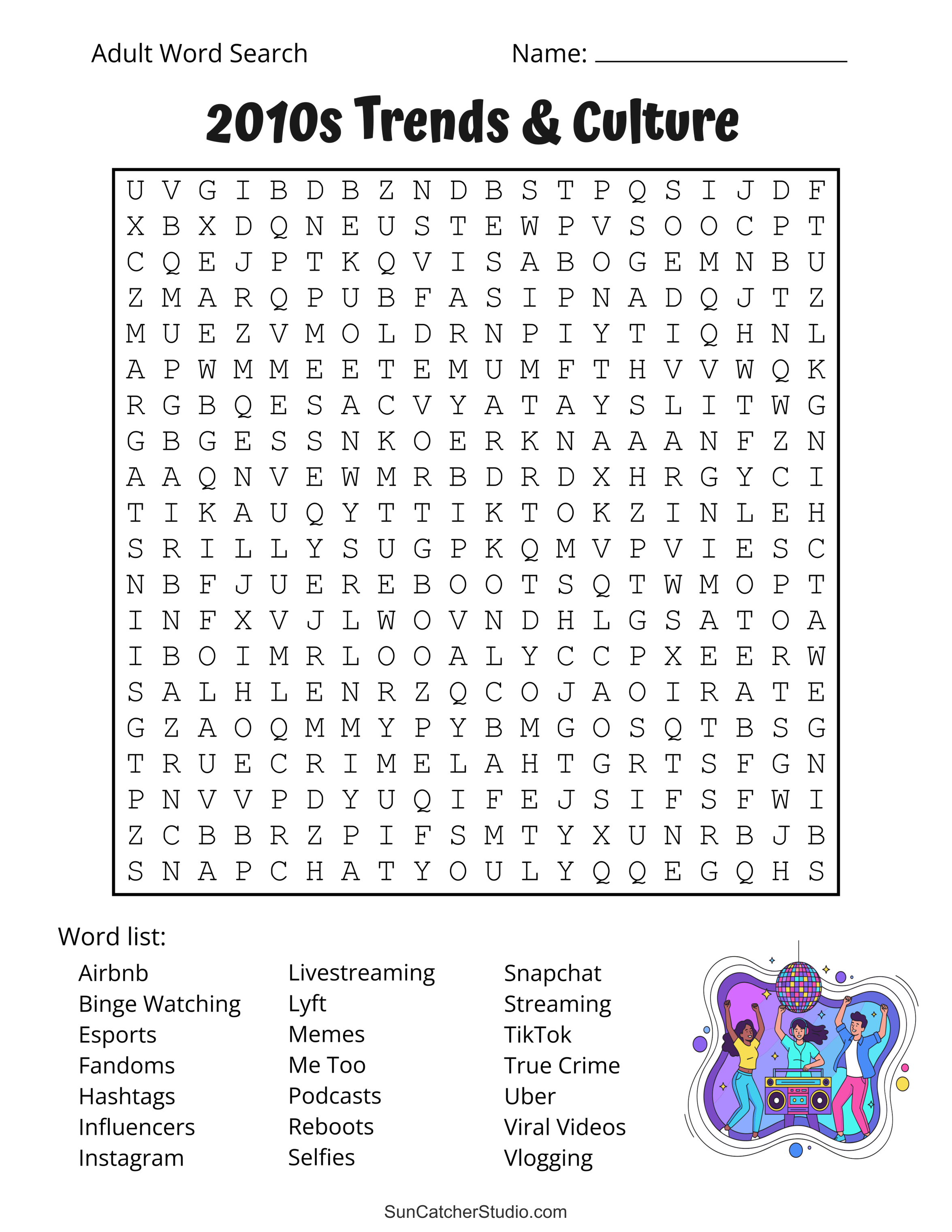 Best of all, our 2010s word search puzzles are completely free to print, so you can enjoy them anytime. Simply download the puzzle, print it out, and start searching for the hidden words. Whether you’re solving them on your own or with friends and family, these puzzles offer a simple and entertaining way to celebrate the culture and trends of the 2010s. However, please note that our artwork may not be resold or hosted on other websites.
