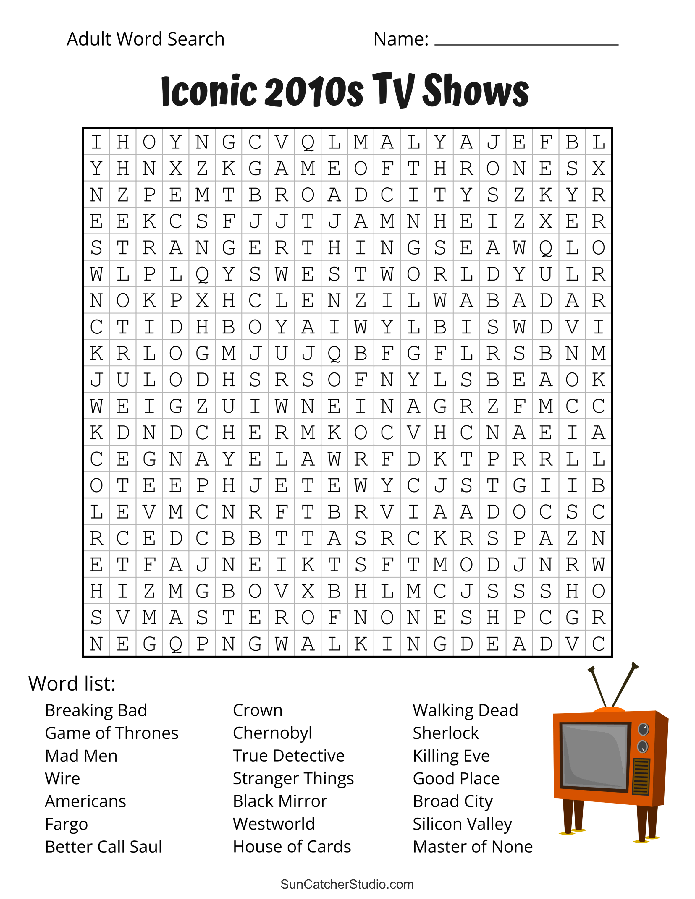 Iconic 2010s TV Shows. Free printable adult word search puzzle. Adult word search puzzles, 2010s, adult word find, printable, free, answers, hard, word search puzzle, large print, PDF.
